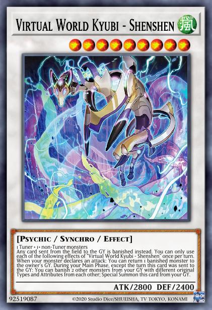 The master of the deck is Virtual World Kyubi – Shenshen, a powerful monster who can do all the above mentioned tricks. It also banishes enemy cards and it can be special summoned from graveyard, which is super convenient for this type of deck.