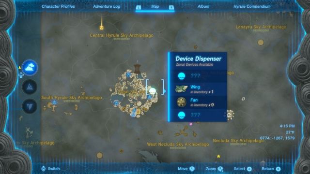 You can easily obtain Wings through the Zonai Dispenser on the island by depositing Zonai Charges. The dispenser can be reached quickly from Gutanbac Shrine (0709, -1381, 1584), and its exact location is 0774, -1267, 1579 — you can find its location marked on the map above.