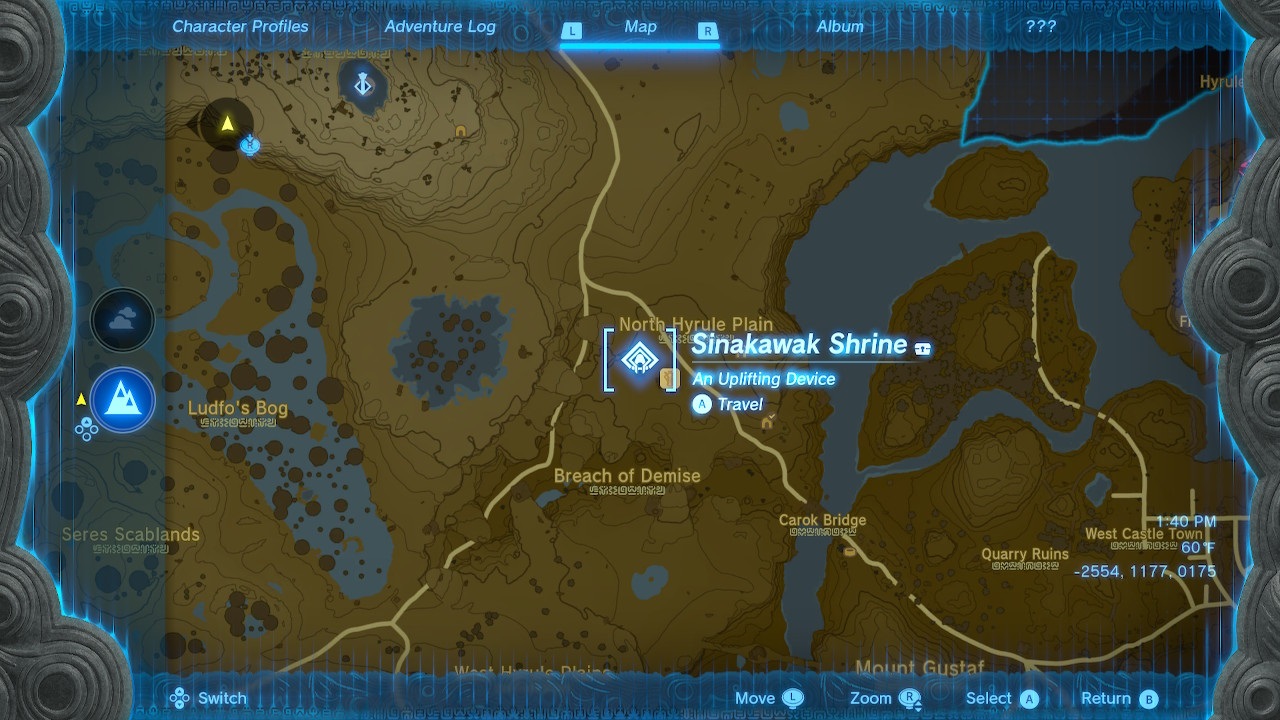 The TotK Sinakawak Shrine is located in the Hebra region to the northwest. It’s just northwest of New Serenne Stable and southeast of the Lindor’s Bow Skyview Tower. On the map, its coordinates are (-1413, 0756, 0089).