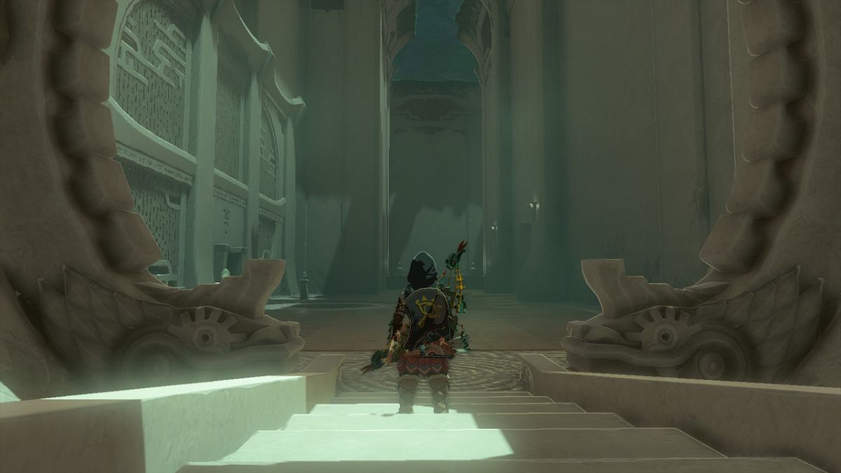 - When you enter, run past the first area and glide or climb down to the lower platform.