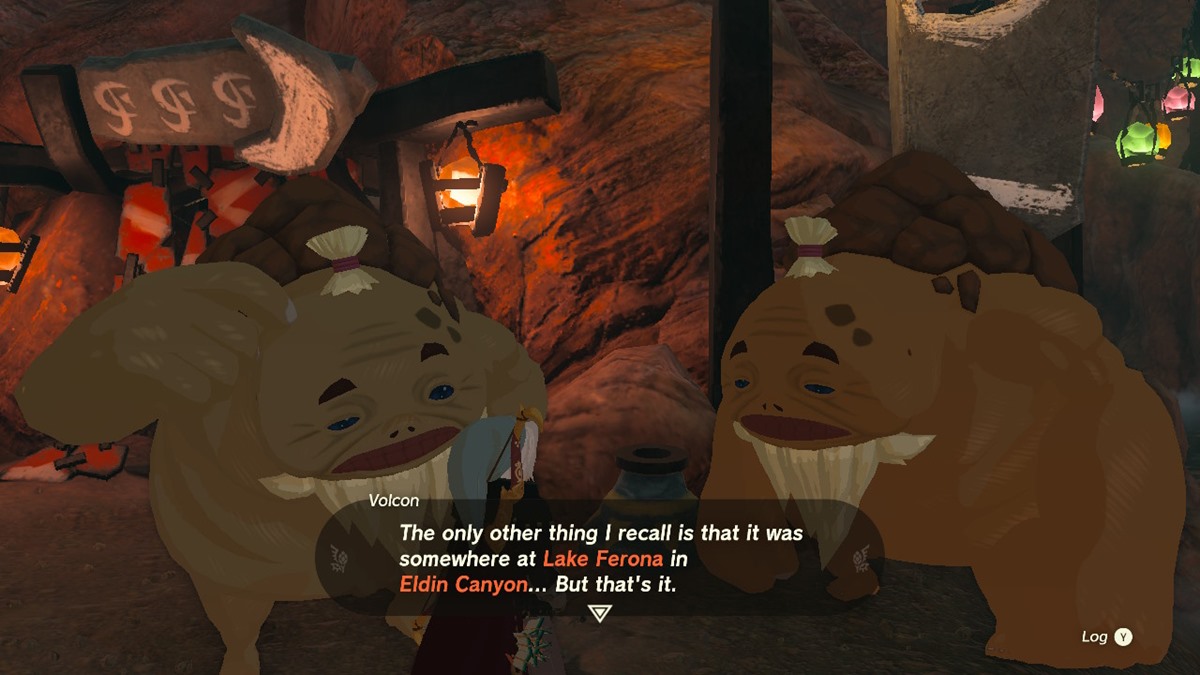 The TotK Moon-Gazing Gorons quest comes from Tray and Volcon, two elderly NPCs in the middle of Goron City. The two are reminiscing about their past, and they tell you certain clues that will lead you toward the picture location: