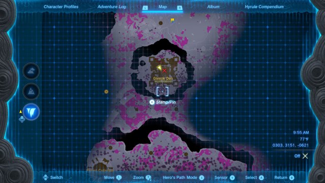 I tried several different methods here, but I landed on using Stealth-increasing armor (like the Stealth armor you can buy in Kakariko Village) to glide down into the alcove with the chest without alerting the enemies. If you don’t have any Stealth gear, you’ll need to clear out all the enemies to get the armor piece. You might also simply warp back to the nearby Lightroot to reset all the enemies and try to stealth your way in again.