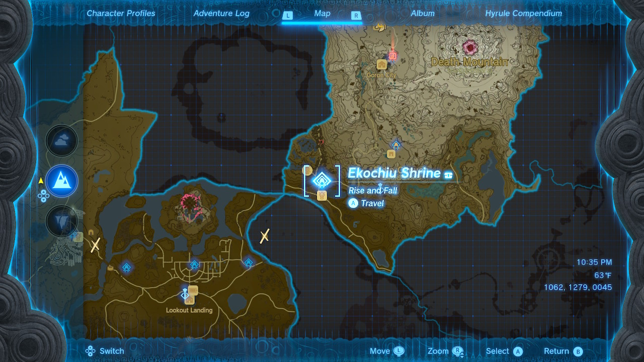 The Ekochiu Shrine is located in the Eldin region to the northeast of Lookout Landing. It’s just north of Woodland Stable and southeast of Tera’s Great Fairy Fountain. On the map, its coordinates are (1062, 1279, 0045).