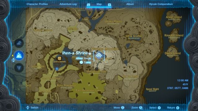 The Ihen-a Shrine can be located on Ploymus Mountain, next to Mipha Court. It’s near Zora’s Domain and the exact coordinates are 3787, 0577, 0486.