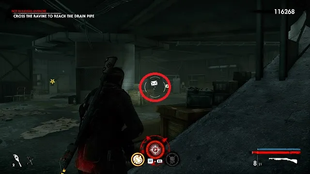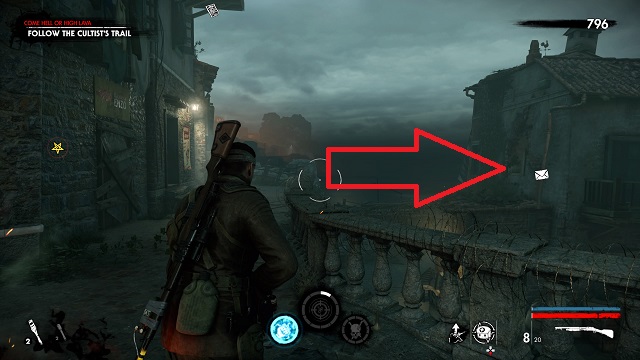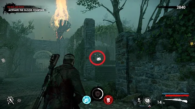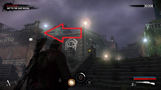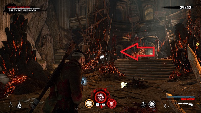 After you fight the Flamer near the end of the level, you’ll get access to the safe room. Instead of going right, go left into the flaming ruins instead. Stay to the far left to get the document in a pool of blood on the ground.
