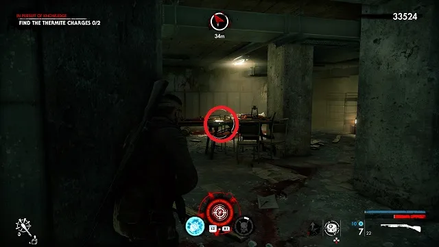 After resetting the fuses a second time, you will need to find thermite charges. In the square mess hall with the Nazi flags, go upstairs and stay to the right. Go through the opening and turn left into a room. The document is on the table closest to you.