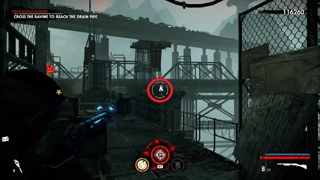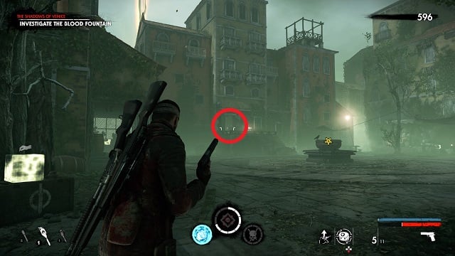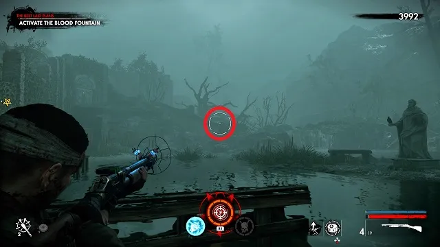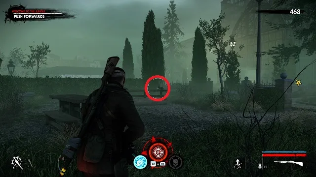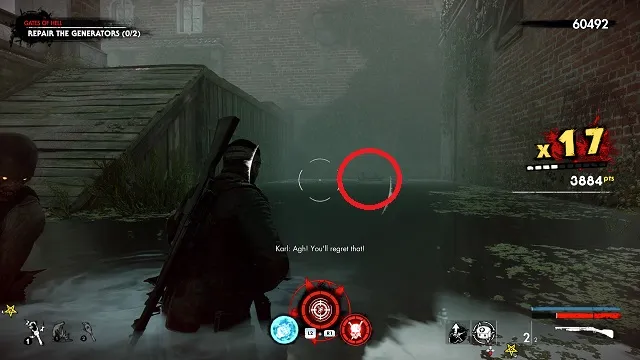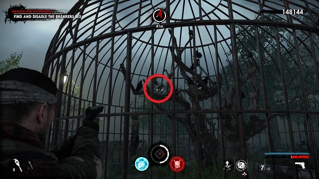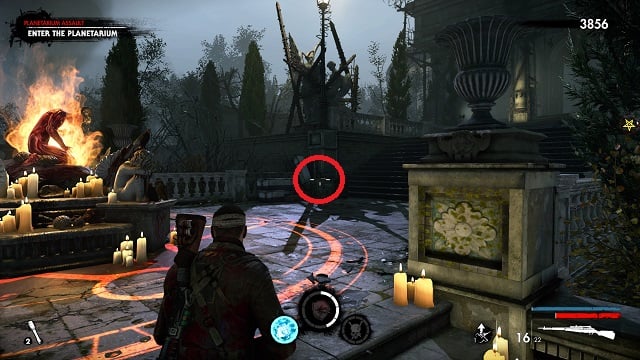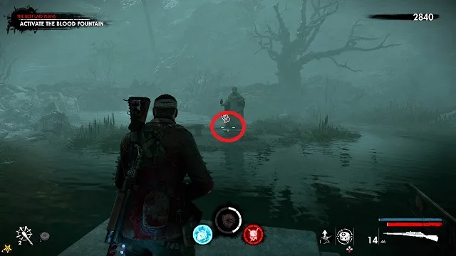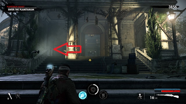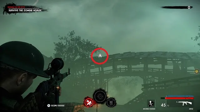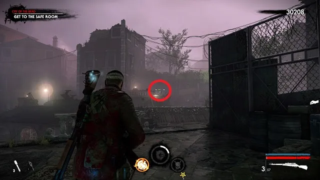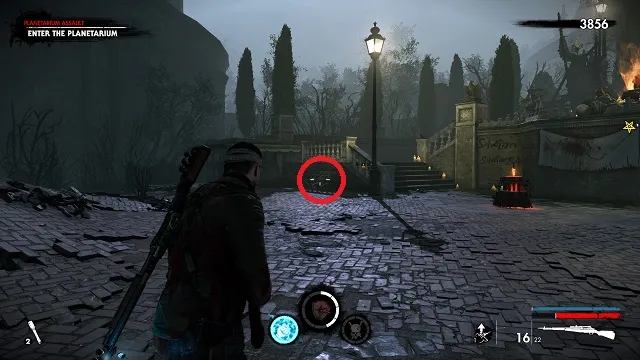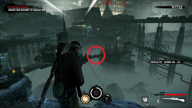 After filling the blood fountain, go through the gates. You’ll hear someone come over the radio for help. Go to the cliff edge overlooking the complex below. Kill the zombies attacking the resistance fight on the bridge between the two circular buildings
