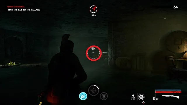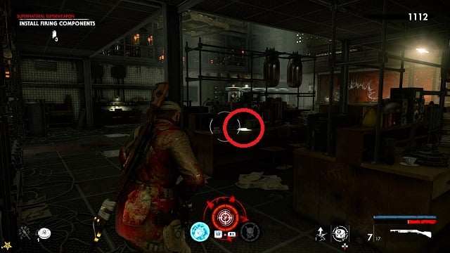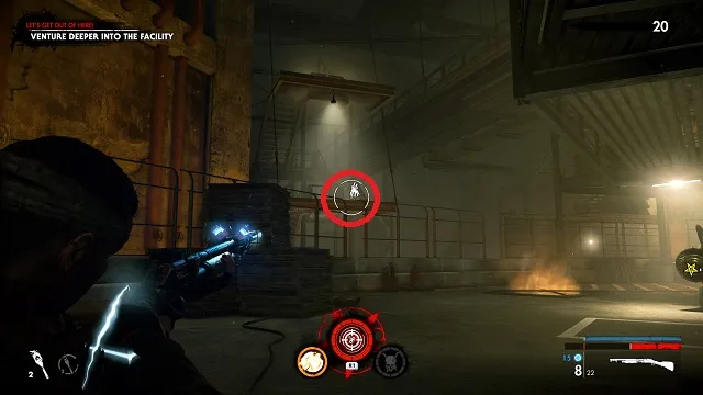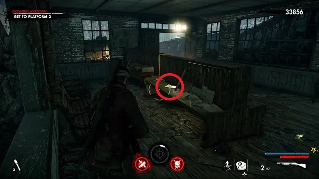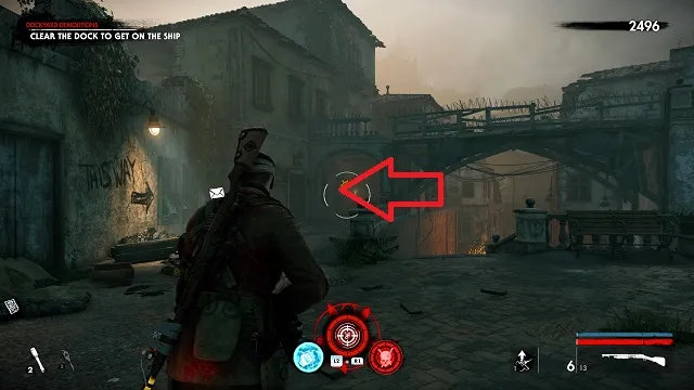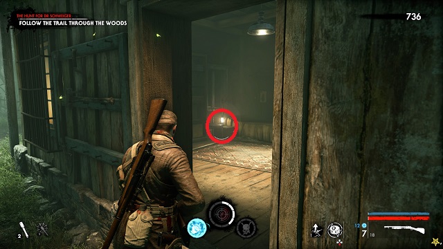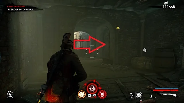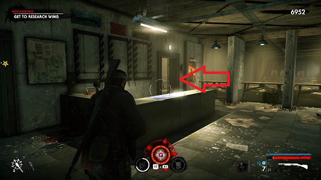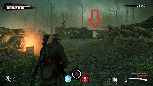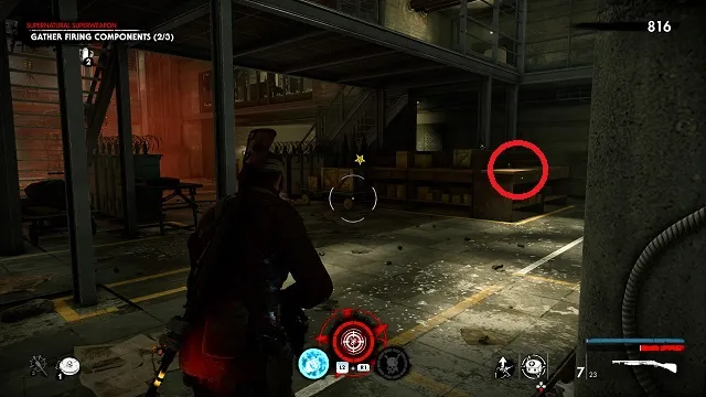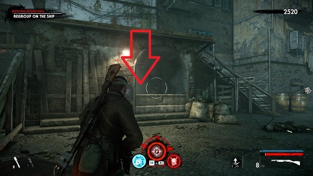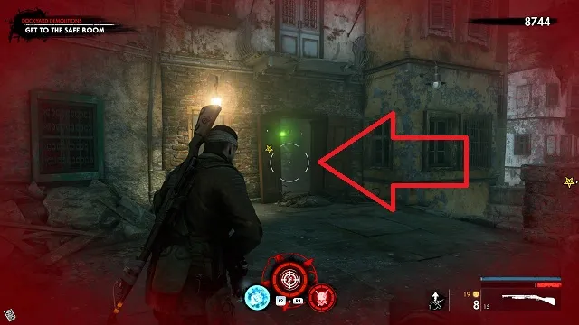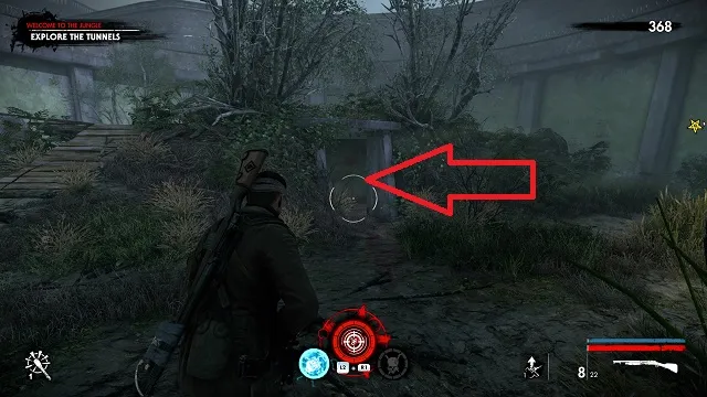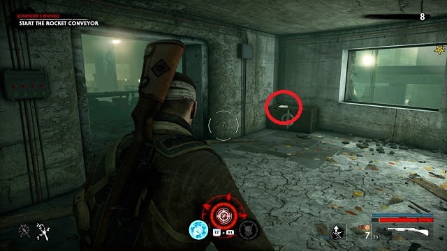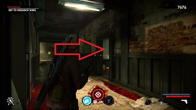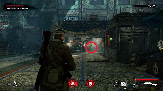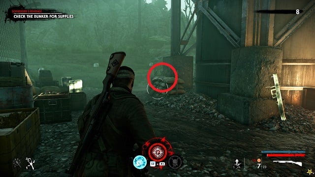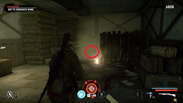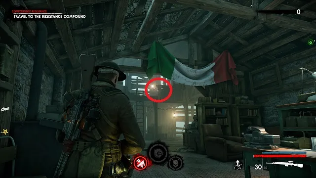 Now activate the switch to open the door and go outside. Go down toward the drainpipe but instead of turning left to go to it, turn right and go around the bottom of the building you just left. You’ll come to a wooden door, open it and turn right inside. The upgrade kit is next to a resistance soldier.