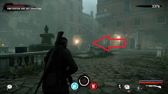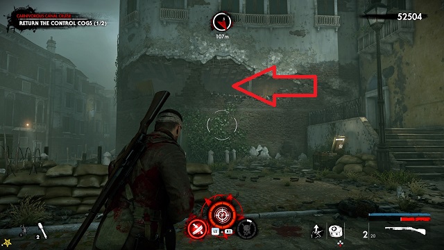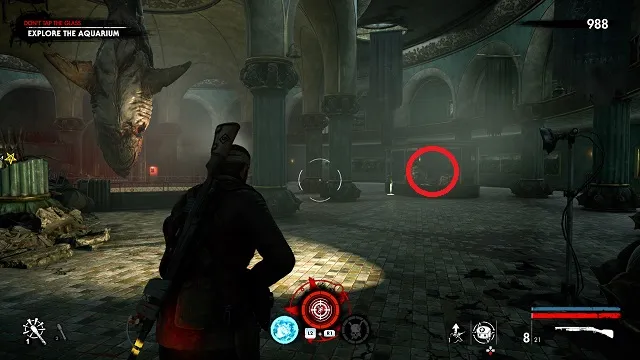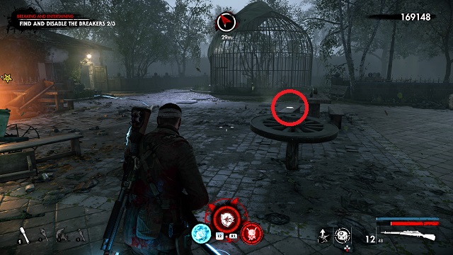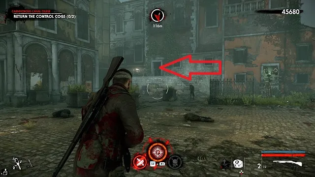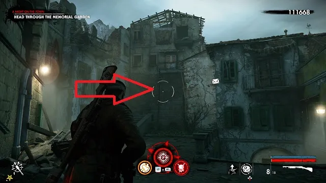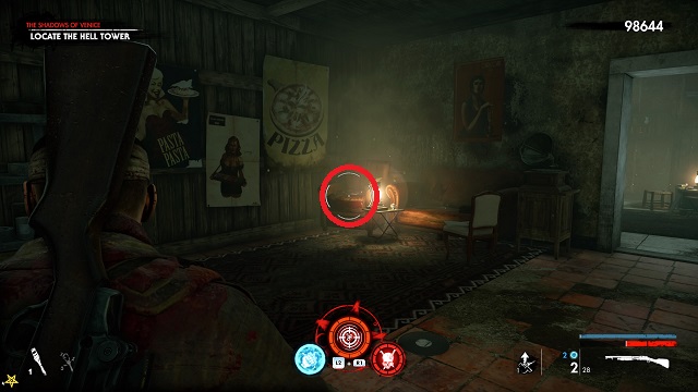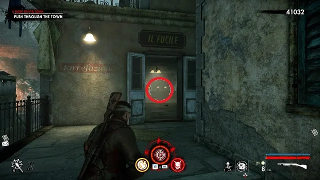 It’s a long time before you get a collectible here. Eventually, you’ll come upon some dead demolition crew. There’s a fortified base around a statue to your left. Continue up the steps and go into an old restaurant called “Il Fucile.” The zombie hand is on the bar.