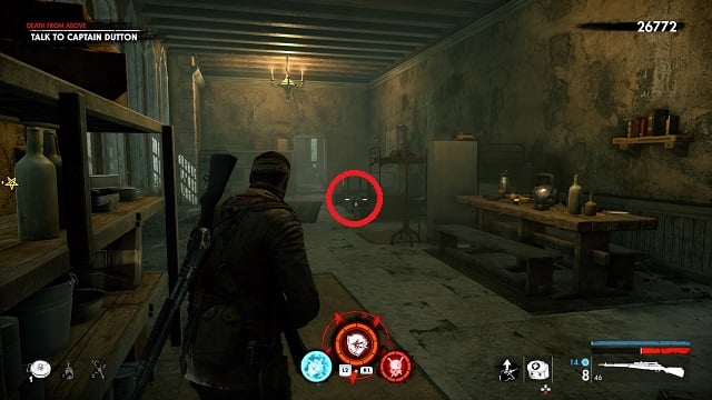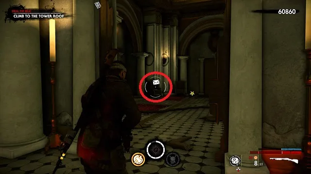 Now go toward the objective and climb the stairs. In the next room, grab the document off the chair in the back left corner.