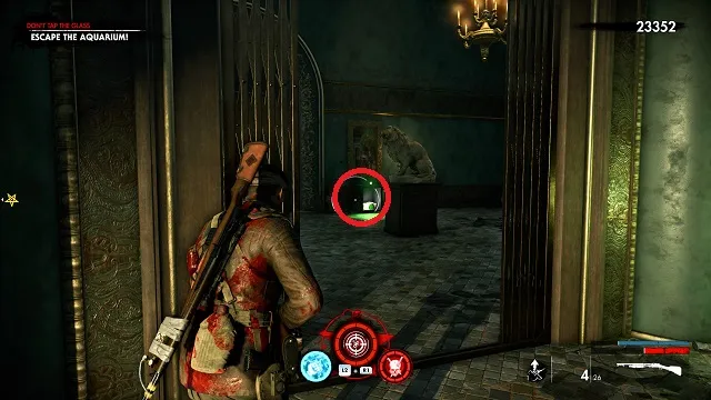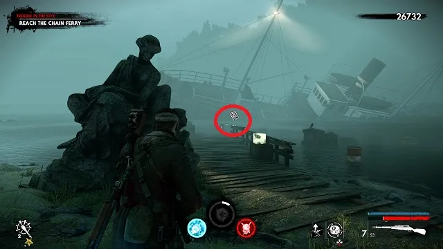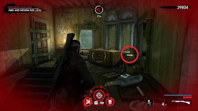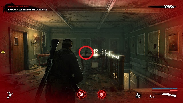 When you stop to work the bridge controls (after refueling the boat), exit the boat and go into the building straight ahead. Inside the building, go up the stairs to the left. Turn around at the top of the stairs and shoot the zombie hand on the table.