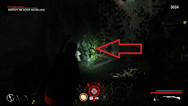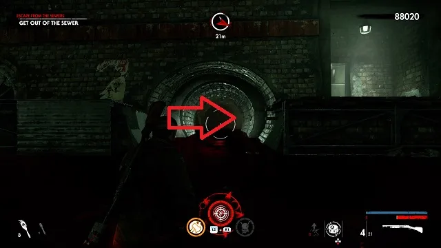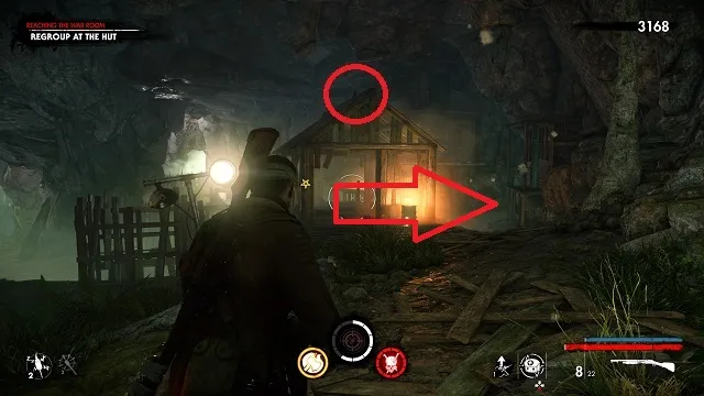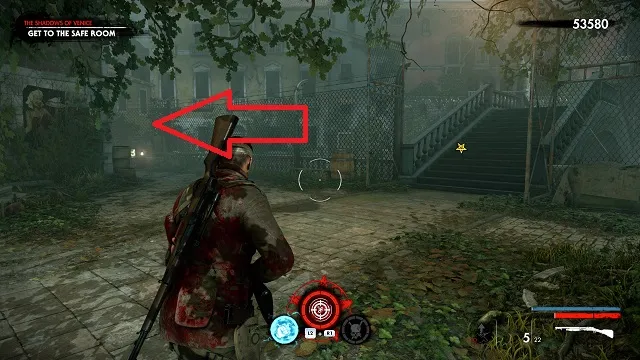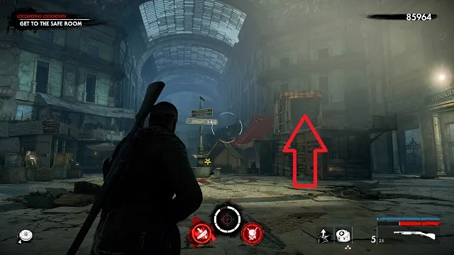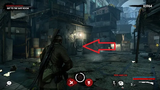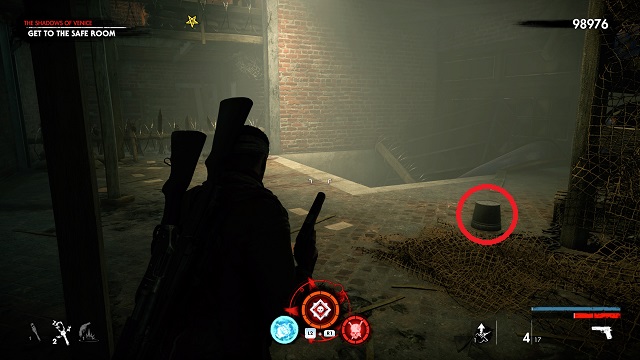 Continue toward the objective past the room with the Christmas lights hanging on the wall. In the next room, your objective will change to “Get to the Safe Room.” Take a right just before the stairs There will be a metal bucket moving on the ground. Shoot the bucket to reveal the hand.