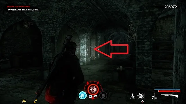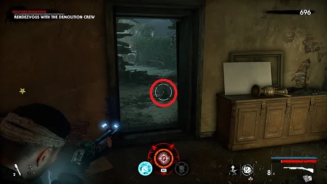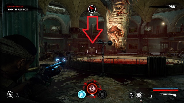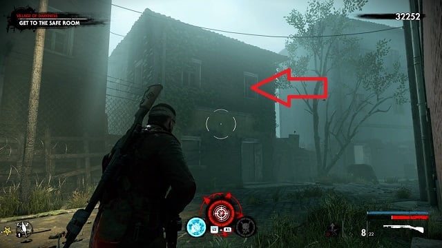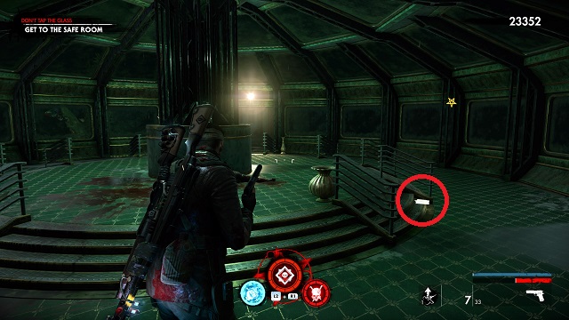 Exit out of the window and go left along the outside of the area. Pass the ammo box and go through the next entryway on your right. Look on the floor as you walk toward the back. The zombie hand is walking around on the floor. This is the room next to the area’s left staircase.