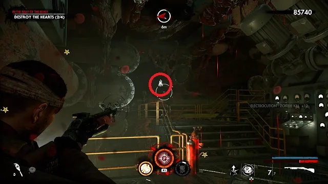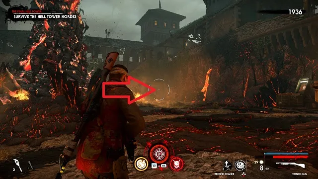 Exit the safe room and follow the path until you reach the main area with the flags hanging on the walls. Follow the stairs down to the bottom floor. There will be a rocket on your left and a red area with Tesla towers in front of you. Look up. The zombie hand is crawling on a wire above.