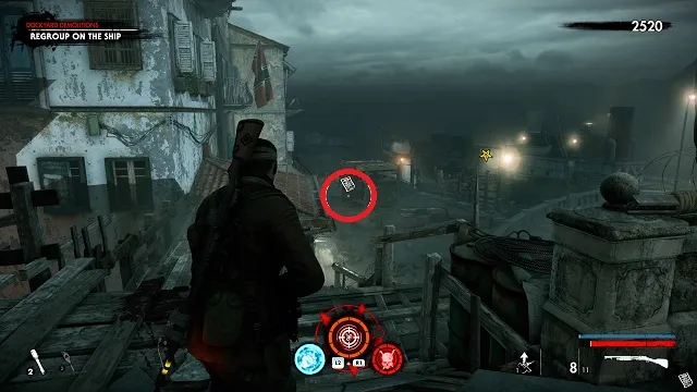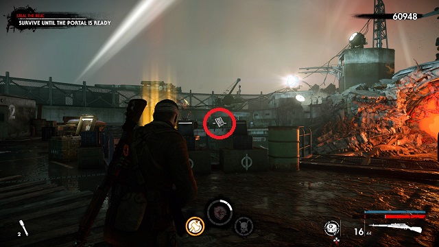 Exit the safe room and go up the ramp. Cross under the hanging flag and toward the silo in front of you. Grab the document off the crate.