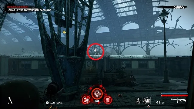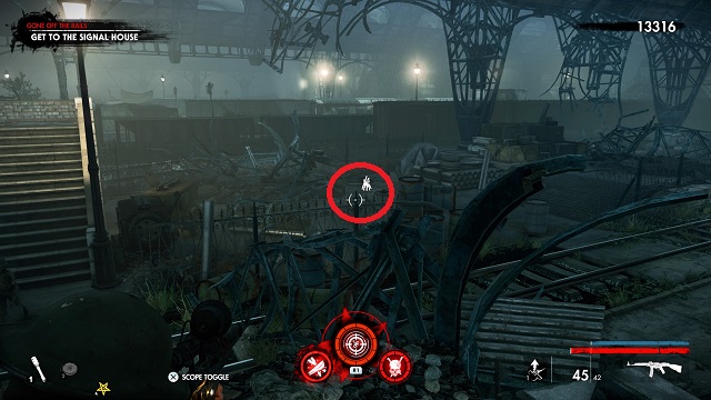 From the upgrade kit, go back up the stairs and cross over to the other side toward the objective. Go across the trains and kill the zombie horde on the slope. Climb to the top of the slope and stop before jumping across. Look to the area to your right. The zombie hand is crawling on the ground in the fenced area.