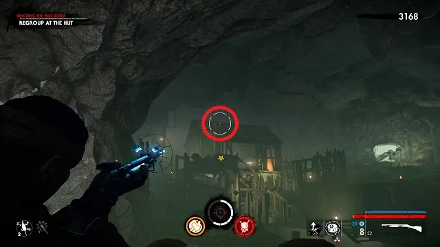 Turn around and head toward the objective. You will need to regroup at the hut. On the roof of the hut (the one marked with the objective marker) is the zombie hand.
