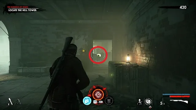 The next collectible is where you encounter a huge number of suiciders. Near the entrance to the area, there is a building one the second level with a red and white pinstripe awning. It is to the right of the “Binario 345” sign. Climb up to the building to find the upgrade kit on a table in the back.
