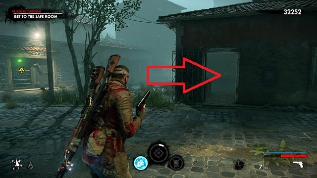 After surviving the zombie horde, go toward the safe room. Just before the bridge, turn left into an alley. Follow the path around. Save the resistance fighter from the zombies.
