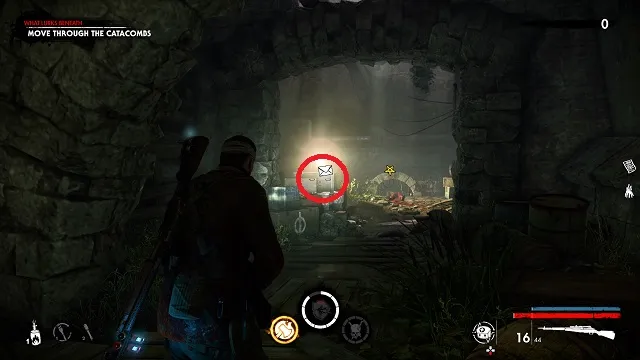 Leave the safe room and follow the path. Drop down the first time and grab the document off of the crates on the right-hand side. It’s in the room with the screamer.